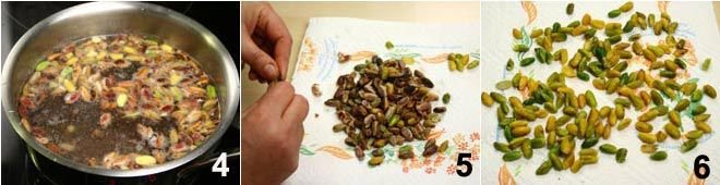 Next, take care of the pistachios: to peel them, just blanch them for a few minutes in a small pot 4, then drain and place them on a piece of paper towel to dry the excess water. The skin will easily come off by applying gentle pressure with your fingers (5-6).