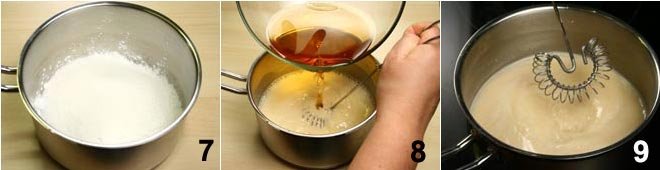 In a saucepan, combine the cornstarch and sugar 7, then add the strained water 8. Place the saucepan over the heat and stir until it thickens 9.