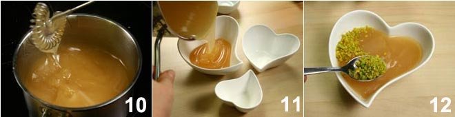 Once it reaches a viscous consistency 10, turn off the heat and pour the cinnamon jelly into bowls 11 and allow it to cool. Serve the cinnamon jelly by sprinkling the surface with chopped pistachios 12.
