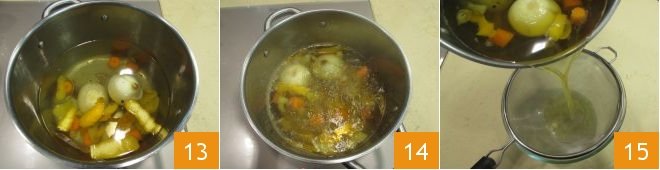 Bring to a boil 13 and let cook for about an hour 14. Then strain everything 15 and keep the broth warm.