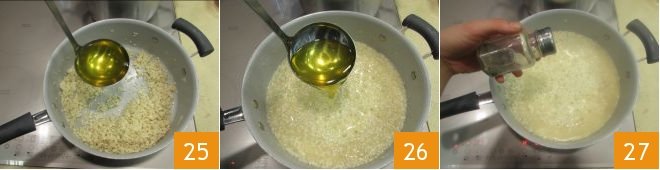 As soon as the alcohol has evaporated, pour in a ladle of broth 25 and continue cooking for about 15-18 minutes, adding more as needed 26 and stirring. For cooking times, we recommend following the instructions on the risotto package. When 2-3 minutes are left and the rice is almost cooked, season with salt and pepper 27.