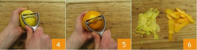 Meanwhile, using a peeler, peel both the orange 4 and the lemon 5, being careful not to take the white part, which would be bitter. Make sure to get rather large pieces of peel 6.