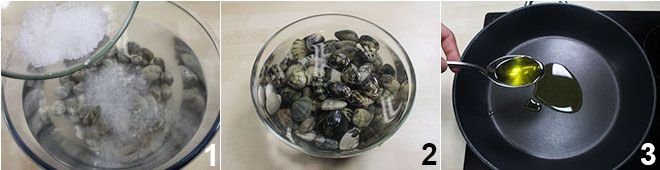 and sauté the garlic cloves, peeled and crushed 4. Drain the clams and add them to the pan 5, pour in the wine 6, and continue cooking over medium heat for a couple of minutes until the wine has completely evaporated.