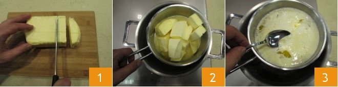 To prepare clarified butter, the first thing to do is to cut the butter into pieces 1, then gather them and pour them into a saucepan and melt in a bain-marie 2. As the butter melts, you will notice a watery substance rising to the surface 3; let it cook over low heat until it has completely evaporated; let it go without stirring.