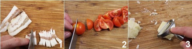 To prepare the classic Amatriciana pastries, cut the guanciale into strips 1 and quarter the cherry tomatoes after washing them well 2. Use a vegetable peeler to create flakes from the pecorino romano 3 and set them aside.
