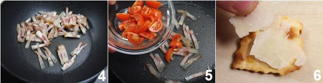 In a non-stick pan, sauté the guanciale 4 and once it is well-browned, add the cherry tomatoes 5 and let them cook together for a few minutes to enhance their flavors. Once ready, assemble the classic Amatriciana pastries: place one or two flakes of pecorino on each pastry 6,