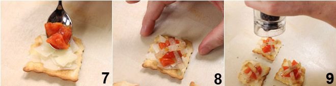 add a tablespoon of sautéed cherry tomatoes 7, and finally a couple of strips of golden guanciale 8. Season all the pastries this way and finish with a generous grind of black pepper 9: the classic Amatriciana pastries are ready!