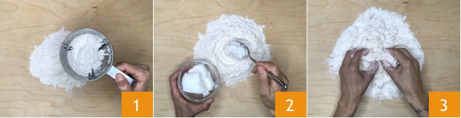 and two egg yolks 7. Then knead with your hands 8, and when you have obtained a homogeneous mixture, form a dough ball 9