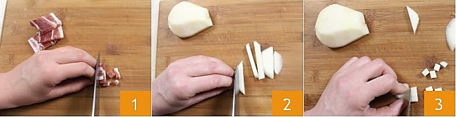 To prepare the classic puff pastries with pears and speck, start by cutting the speck into very small cubes 1, then peel the pears, remove the core, cut them in half, and then into thin slices, which you should further reduce into small cubes (2-3). It’s best to cut the speck and pears to the same size so that the cooking will be even.