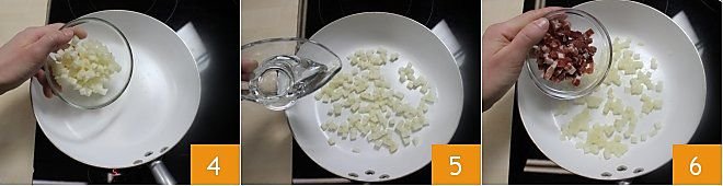 Place the pears in a pan 4 and add the water 5 and let them cook over high heat for about 10 minutes. At this point, add the speck 6 and continue cooking.