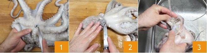 To prepare the club sandwich with octopus and potatoes, start by How to Clean and Cook Octopus. After removing the part underneath where the beak is 1, remove the eyes 2 and rinse the mollusk well.