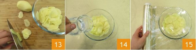 and slicing them thinly 13, place them in a bowl and pour enough water to just cover them 14. Cover with plastic wrap 15