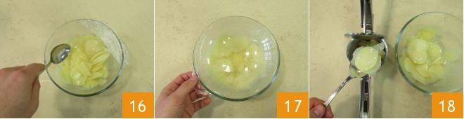 and cook in the microwave at 900w for 8 minutes: turn the potatoes halfway through, being careful not to burn yourself with the steam 16. When they are ready, let them settle for a few more minutes still covered 17, then pass them through a potato masher 18