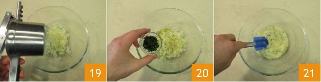 to obtain a soft puree 19. Don't worry if you see some water coming out; it will keep the mixture creamier. Then season with oil, salt, pepper, and chopped parsley 20, mix, and set aside 21.