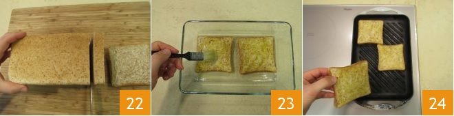 Prepare the bread: slice it to obtain slices weighing about 25 grams (0.9 oz) each, in total you should get 12 22. Brush with a little oil 23 and grill these too on a hot grill 24.