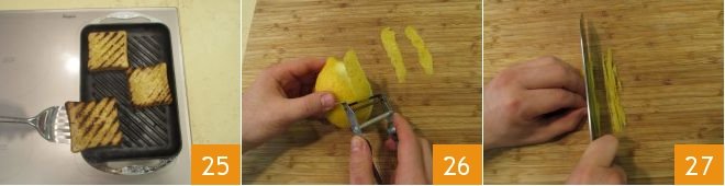 After a few moments, turn the slices over and let the other side brown 25. Finally, prepare the salad: wash and dry a lemon, then peel with a peeler, being careful not to take the white part 26, and cut into very thin strips 27.
