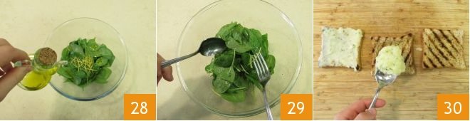 Pour the spinach leaves into a bowl and garnish with oil, salt, and the thin lemon zest 28. Squeeze the juice from one half and mix 29. Finally, you can move on to the assembly. The club sandwich is made up of 3 slices and 2 layers. So, spread the potato cream on 3 slices of bread 30,