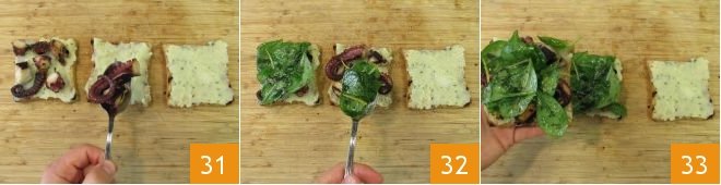on 2, add the octopus pieces 31 and the salad 32. Then place the first slice on the second 33