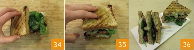 and the last, with the cream facing the filling, will act as a cap for the others 34. Here is the first club sandwich with octopus and potato salad ready 35; continue like this with all the others and remember to cut them diagonally before serving them 36!