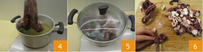 Then, in a pot with boiling water scented with bay leaves, dip the tentacles 3-4 times 4 before completely submerging them and covering with a lid 5. Remember that 1 kg (2.2 lbs) of octopus cooks in about 40-50 minutes: use the fork test to check if it's cooked. At the end of cooking, let it cool slightly before cutting it into pieces of about 1.5 cm (5/8 inch) 6.