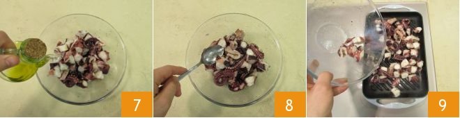 Finally, season with a drizzle of oil 7, adjust the salt, and mix well 8. Then heat up a grill and cook the octopus pieces for a few minutes 9