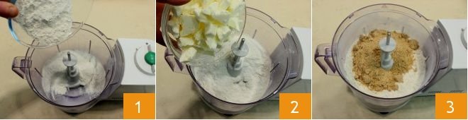 To prepare the cocoa and hazelnut cookies with jam, start with the Cocoa and Hazelnut Shortcrust Pastry: place the sifted flour 1, cold butter from the fridge 2, and hazelnut flour 3 in a mixer.