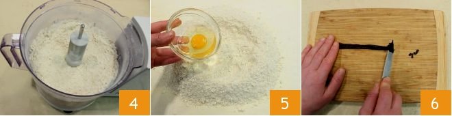 Operate the blades to achieve a sandy texture 4, then transfer the mixture to a work surface and create the classic well. In the center, place the egg 5. Then cut a vanilla pod and scrape out the seeds with the blade of a knife 6.