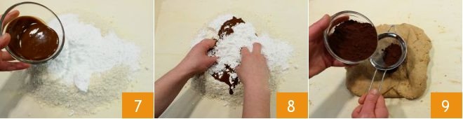 Add them to the center of the well along with the sifted powdered sugar and hazelnut paste 7. Quickly combine everything with your hands 8 just until the dough comes together. Then add the sifted unsweetened cocoa powder 9;
