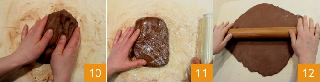 handle the mixture to incorporate the cocoa 10 and form a dough: flatten it slightly and wrap it with plastic wrap 11. Place the dough in the refrigerator to firm up for at least an hour; after the necessary time, roll out the dough into a sheet about a quarter-inch thick 12.