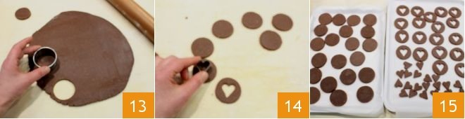 Using a 2-inch diameter cookie cutter, cut out 20 discs 13, then on half of them, use heart-shaped cutters with a 1-inch diameter to cut out hearts 14 (the hearts you extract can be baked together with the other cookies) 15.