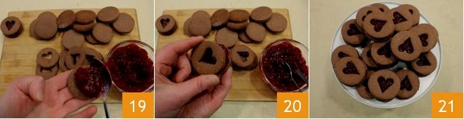 Then, spread raspberry jam on the discs 19 and close with the heart halves 20. Your cocoa and hazelnut cookies with jam are ready 21!