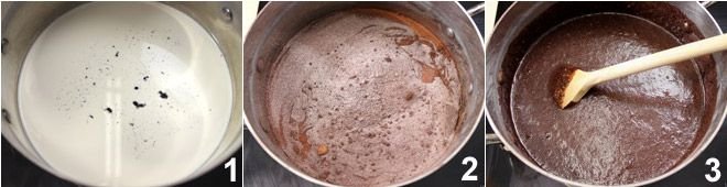 To prepare the cocoa and vanilla cream, start by heating the milk with the cream in a small saucepan. Add the seeds of the vanilla bean, which you have cut lengthwise with a knife 1. Also incorporate the sugar and sifted cocoa 2 and bring to a boil, stirring continuously to dissolve lumps and obtain a smooth mixture 3.