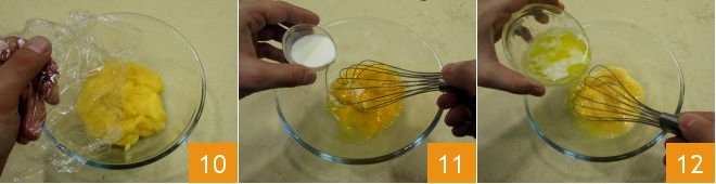 In the meantime, in a separate bowl, beat the egg yolks with the sugar 4 and the cornstarch 5. Mix well with a whisk 6 until you get a homogeneous mixture.