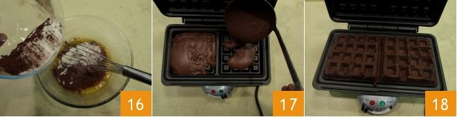 Add the sifted dry ingredients to the eggs and mix 16 until you get a smooth batter without lumps. Heat the waffle iron and pour a ladle of batter for each portion, spreading it evenly on the plate 17. Close the plate and let it cook for 3-4 minutes: with ours, you should get 4 waffles. Once ready 18,