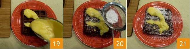 pour the now cold mandarin cream over the waffles 19 and finish with a dusting of powdered sugar 20: your waffles with mandarin cream are ready to be served hot 21!