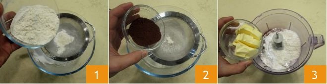 To prepare the cocoa tart with ricotta and chocolate cream, start with the Cocoa shortcrust pastry; sift the flour 1, the bitter cocoa powder 2, and the powdered sugar, then pour the dry ingredients into a mixer along with the cold butter cut into cubes 3. Blend everything until you get a sandy and floury mixture,