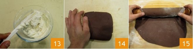 mix with a spatula 13, cover with cling film and place in the refrigerator. After the necessary time 14, roll out the cocoa dough with a rolling pin, using as little flour as possible, to a thickness of about 1/4 inch forming a circle 15.