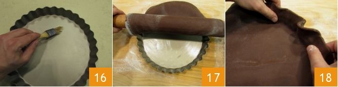 With a brush, lightly butter a 9.5-10 inch cake tin (alternatively, you can use a tart pan) 16. With the help of a rolling pin, line the tin with the shortcrust pastry 17, making sure the edges adhere well 18.