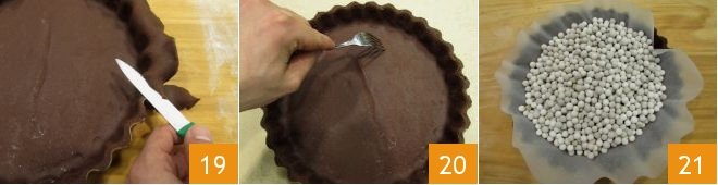 Cut off the excess dough, keeping the edge at least 3/4 inch high: set aside and recompact the scraps, you will need them for the final decoration 19. Poke the bottom with the prongs of a fork 20, and cover with a sheet of parchment paper that you will fill with dried legumes or porcelain spheres for blind baking 21. Bake in a preheated static oven at 350°F for 20 minutes (or at 315°F for 12 minutes if using a convection oven). After this time, remove the ceramic spheres (or legumes) and parchment paper and let it bake for another 5 minutes at the same temperature. Once ready, take it out of the oven and let it cool.