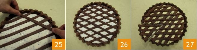 Arrange the shortcrust strips on the ricotta cream diagonally 25 to form a lattice pattern 26. Bake again in a preheated static oven at 350°F for 10-15 minutes (or at 315°F for 8-10 minutes if using a convection oven). Once ready, let it cool completely; finally, you can serve your cocoa tart with ricotta and chocolate cream 27.
