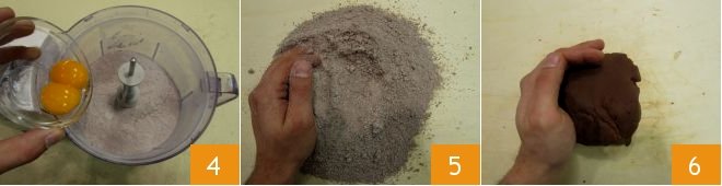 then add the egg yolks 4 and continue blending. Transfer the dough (which will still be floury and not mixed) onto a work surface 5 and knead vigorously with your hands until you get a rather compact and smooth dough 6.