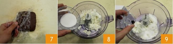 Form a dough ball, wrap it in cling film 7, and let it rest in the refrigerator for 30 minutes. Meanwhile, prepare the ricotta and chocolate cream: place the ricotta, granulated sugar 8, and the seeds of a vanilla pod 9 in a mixer with blades.