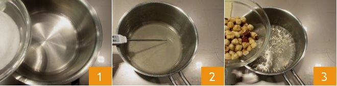 To make the coconut and Nutella truffles, you first need to caramelize the hazelnuts. In a saucepan, combine the water and sugar 1, turn on the heat and, using a candy thermometer, bring the caramel to a temperature of 241°F 2. Turn off the heat and immerse the whole hazelnuts 3.