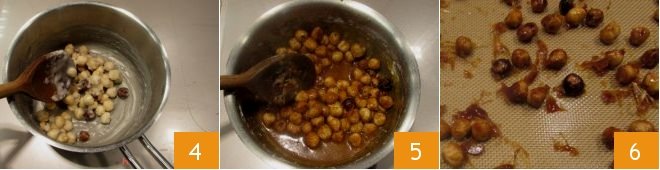 Stir until the mixture becomes sandy 4. At this point, put the saucepan back on the heat and melt the sugar over low heat until it turns amber 5. Transfer the caramelized hazelnuts onto a tray lined with parchment paper or a silicone mat, separating them to avoid sticking together as they cool 6.