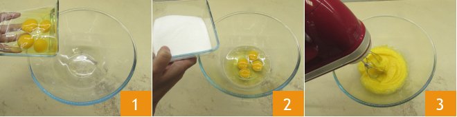 To make the coconut bundt cake, pour the whole eggs into a large bowl 1, add the sugar 2 and whisk with an electric mixer on high speed 3.
