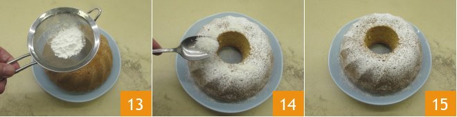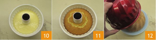 Bake 10 the bundt cake in a preheated static oven at 350°F for 40-45 minutes, depending on the power of your oven. Once baked, take the cake out of the oven and let it cool slightly 11, then turn it out onto a plate 12.