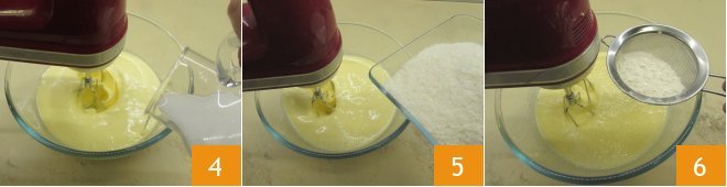 When the mixture is light and frothy, pour in the coconut milk 4, once incorporated, also add the shredded coconut 5, the sifted flour 6