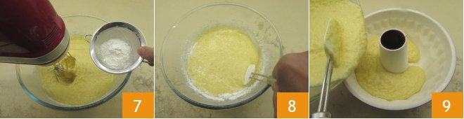 and also the sifted baking powder 7. Once combined 8, pour the batter into a greased and floured 8-inch diameter and 4-inch height bundt pan 9.