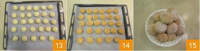 With the indicated doses, you will get about 29-30 cookies, place them on a baking sheet lined with parchment paper 13. Bake the cookies in a preheated static oven at 350°F for 20 minutes. Once cooking is complete, remove the cookies from the oven 14, let them cool, and then serve them with a dusting of powdered sugar 15.