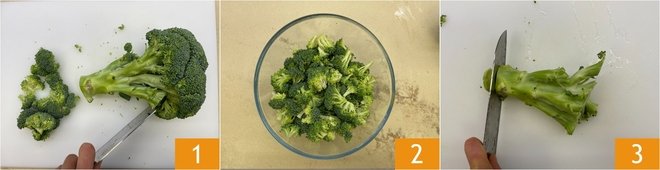 To prepare the coconut fried rice, clean the broccoli, remove the outer leaves, separate the florets 1 and set them aside 2. Cut off the stem end 3 and remove the tougher outer layer.
